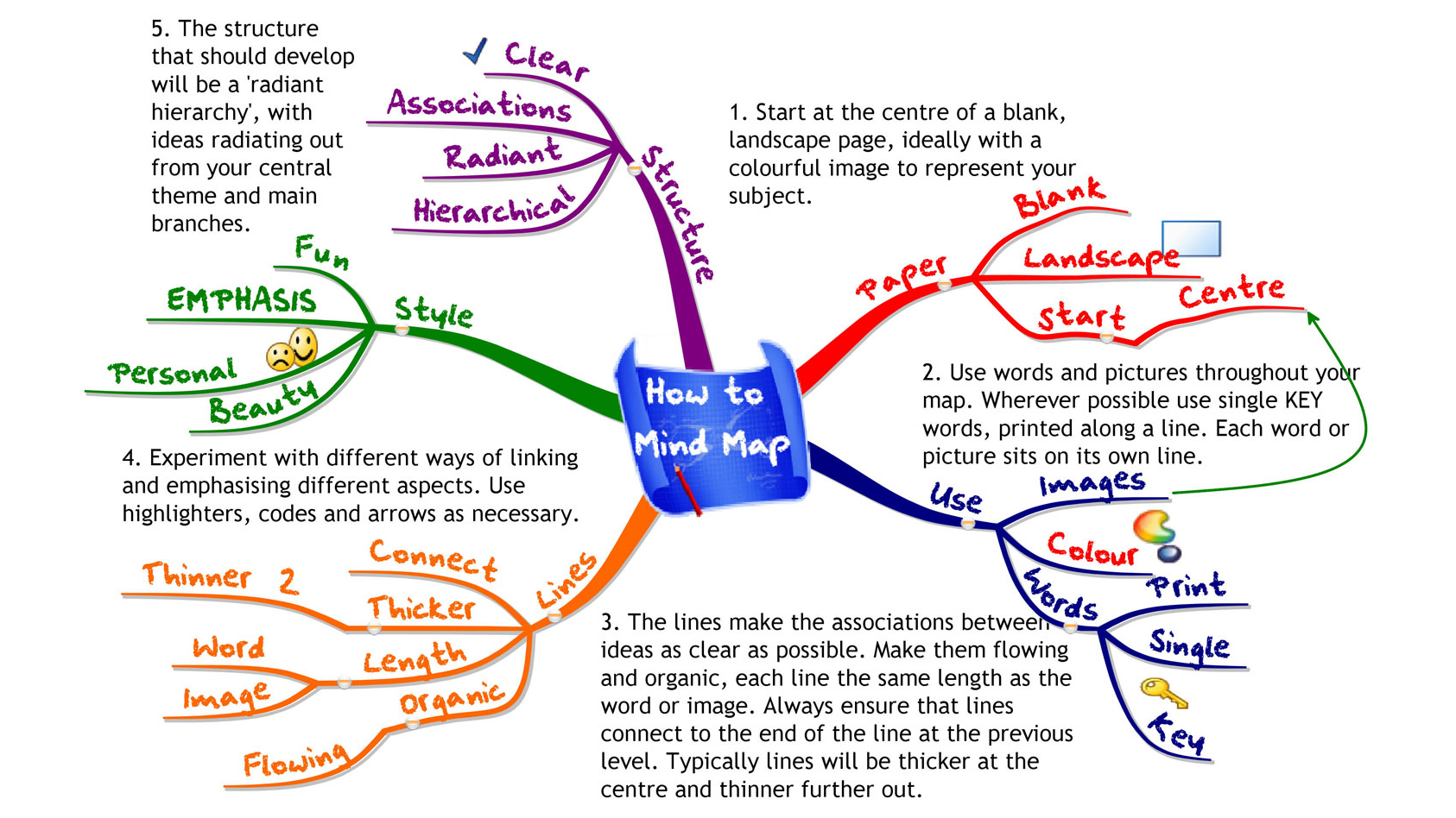 The 'Laws of Mind Mapping' were originally devised by Tony Buzan when he codified the use of imagery, colour and association and coined the phrase 'Mind Mapping'. In the intervening 30 plus years, there have been many variations on the original 'Mind Map ' and the widespread usage of mapping software of various sorts, has dramatically changed what is possible.